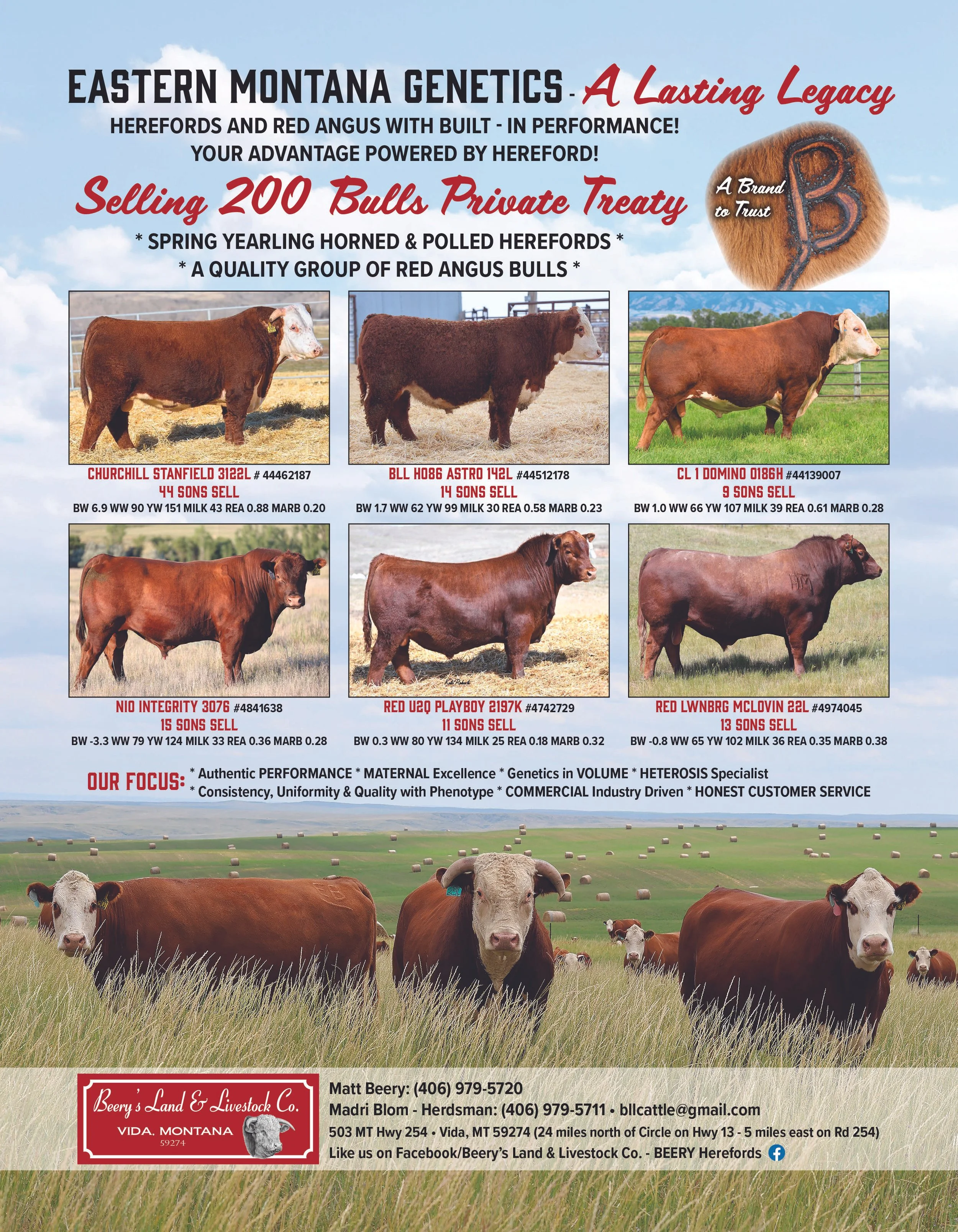 Welcome to the long history of Beery Herefords. Lawrence Beery started in the Hereford business in 1912. Nephew, Newell Beery, walked into the Vida area in the summer of 1929, riding for his uncle there, gathering horses, and working on their ranches. He later settled in 1936 on a half section a half mile from the current ranch headquarters. In 1940, Newell purchased his first set of registered cows. From there on, he always purchased the best registered Hereford range bulls he could afford to use in the program. With that came a reputation for quality Hereford feeder cattle. In the mid-1950s, Newell and his eldest son, Eddy, pursued further into the registered cattle business, purchasing cows locally in Montana and into North Dakota. Beginning in 1970, throughout many years, Newell, Eddy, and family produced and sold quality Hereford genetics even through drought and economics of the 1980s, always with their customers in mind by breeding with honesty, soundness, adaptable, and profitable cattle with the hardiness of living in Eastern Montana. These traits are still prevalent throughout the cattle that the Beerys raise today.